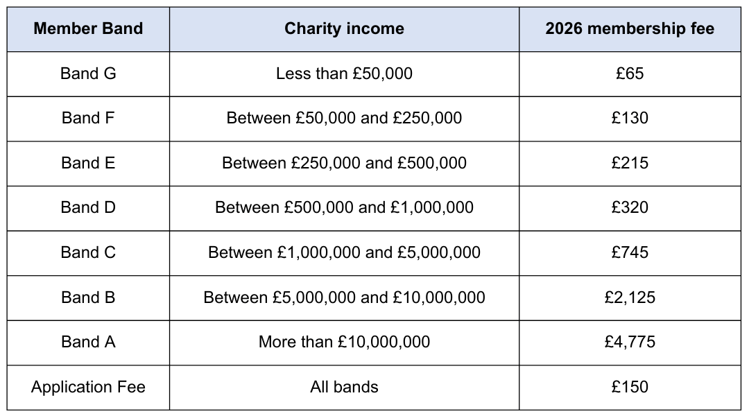 Membership is affordable and offers tremendous value. Membership fees are on a sliding scale based on your income as submitted to the relevant charity register for your jurisdiction (e.g. Charity Commission, OSCR, Charities Register) as at 31 December each year.